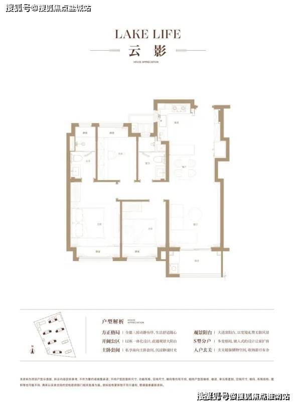 建面约96㎡3房2卫户型,三开间朝南,全卧室带飘窗。户型的采光、视野非常出众。主卧套房设计,保证私密空间。S型的分户墙,褪去呆板,为家具预留更多的空间;经典的餐厨客厅一体的大客厅,作为“家庭厅”使用,可作为亲子游戏、娱乐健身等空间。
