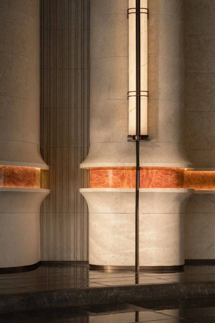 外立面借鉴帝国大厦顶部收缩的垂直美学、立面构成以及沙逊大厦强化基座的稳定感,在设计上实现了经典与现代的融合。通过硬朗直线呼应柔和曲线勾勒,辅以温润石材与古铜色金属线条融合,打造东西方美学共融的艺术藏品。