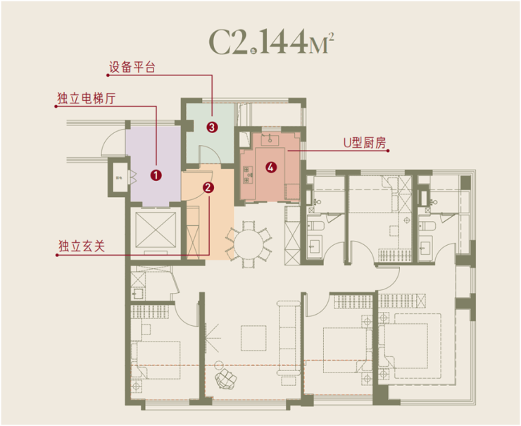 建面约144㎡户型样板间效果图: