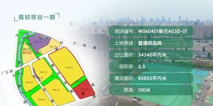 A03D-01地块:出让土地面积34340平方米,土地用途为普通商品房,规划容积率2.5,计容建筑面积85850平方米。