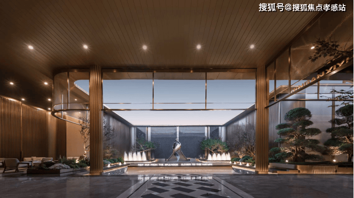 入口处酒店港湾式落客空间,艺术感造型树,蓝翡翠奢石达到第一眼的惊艳;内部精致典藏的水院空间,以雕塑、喷泉水幕、造型树经典组合,打造全区景观点,更大地扩充与景观的接触面,度假的松弛感油然而生。