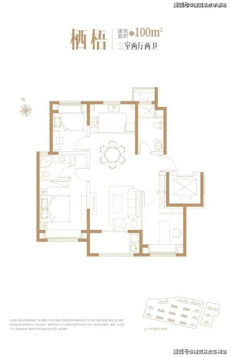 建面约100㎡户型3室2厅2卫▼
