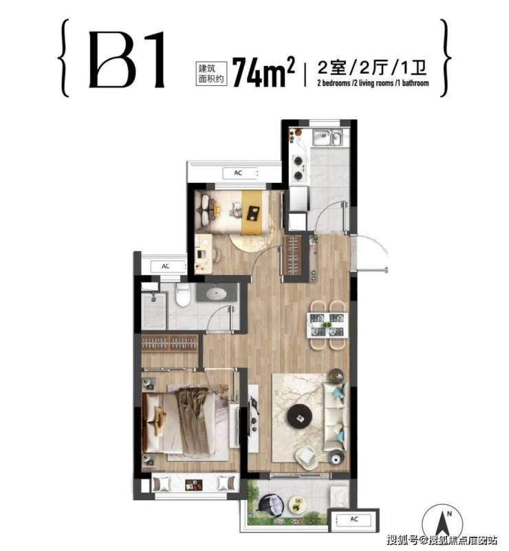 建面约73㎡的2房户型,以其优越的空间布局生动诠释了“小户型也有大面宽”。