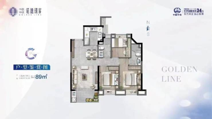 中铁诺德•璟宸有三种户型:约89平的三房两卫,约99平的三房两卫,和约129平的四房两卫。
