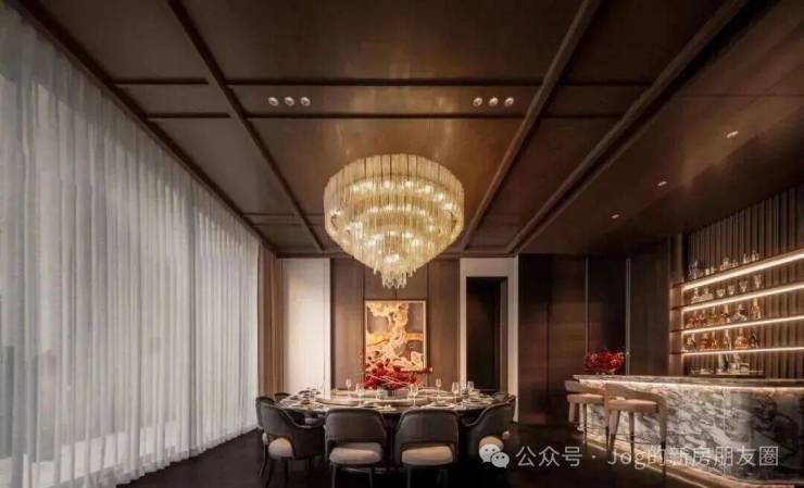 而业主专享的私宴厅则是将 “尊贵感”说到了极致! 臻选奢石营造雅致屏风,墙上大师匠呈繁花艺作,定制灯具璀璨生辉,摩登意蕴充盈其中,匹配大人物品位。除了敞阔的就餐空间,还独立配置吧台、品茗休息区。暮色四合,华灯初上,谈笑风生中展现风雅从容,觥筹交错间皆是繁华丰茂。