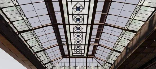 继续向里走,廊道内可见经典的石材立柱、拱形的吊顶、PRADA荣宅的手绘彩玻、繁花的地面拼花等用材工艺,移步异景间,是别样的摩登魅力。