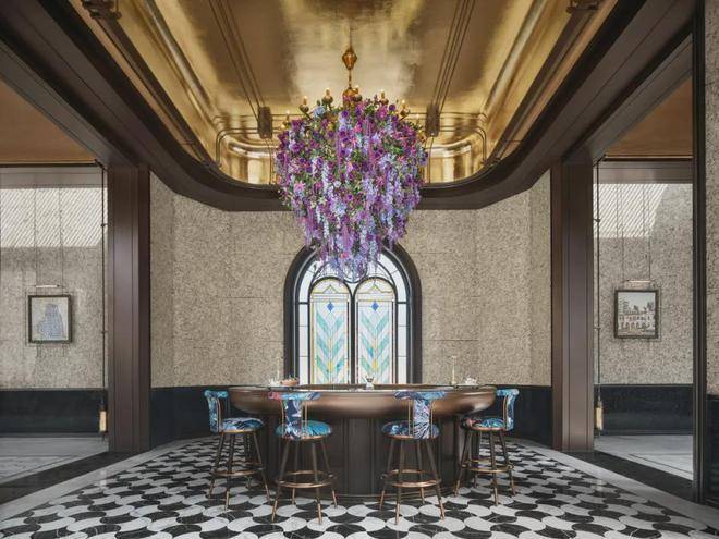 走进落客区,头顶美轮美奂的约300㎡彩色玻璃穹顶,灵感来自于和平饭店,融入老洋房PRADA荣宅的特殊徽章转译。其中水波纹玻璃、镶嵌玻利维亚蓝奢石带来了丰富的层次感,光影相间的繁复感,仿佛让人步入时光长廊,这样充满艺术性的归家礼仪,让人一眼着迷!