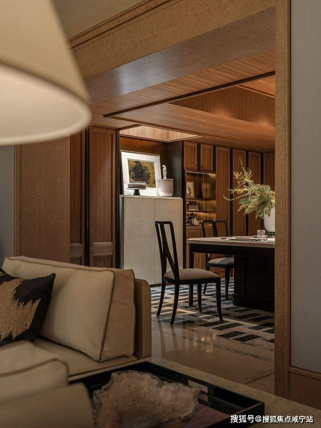 在动线设计上,影音雪茄室取消了独立门扇,书柜处被设置为通道。