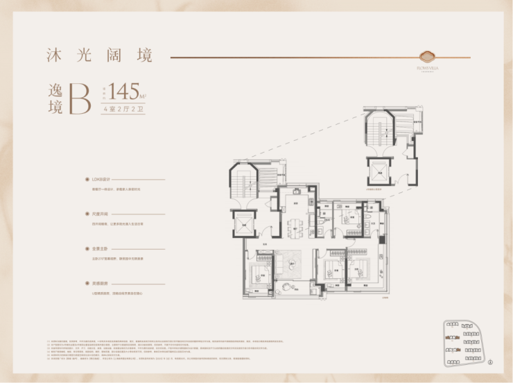 户型特点:下叠边套,南向面宽约9米,客餐厅同宽约5.8米,空间开阔。一楼设南向卧室,采光好且视野佳。二楼为三套房+主卧总统套房设计,主卫南向,可容纳浴缸和双台盆。地下室方正,附赠采光井,利用率高。
