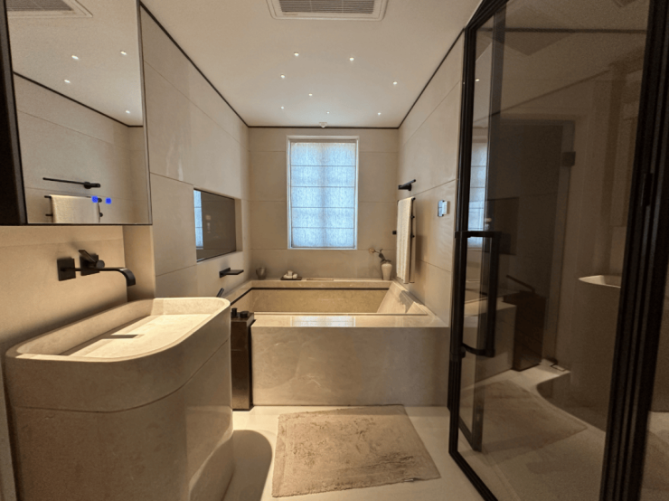 而样板间里这第二个卫浴空间,更接近于享受级。嵌入式浴缸,设计了魔镜系统,可以供业主泡澡时观影娱乐;除此之外,这个卫生间也有独立的淋浴房,并设计有桑拿房。