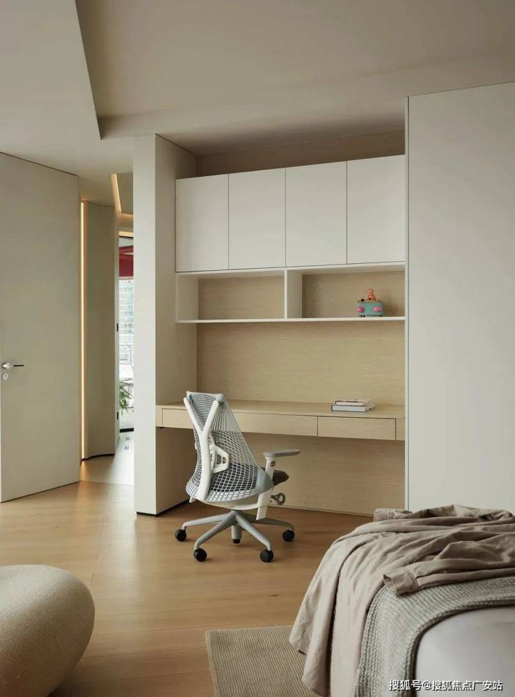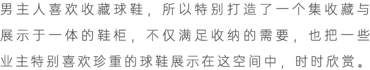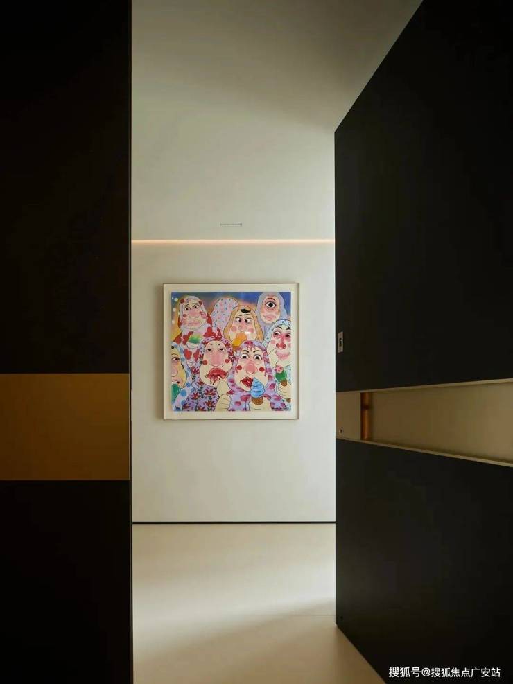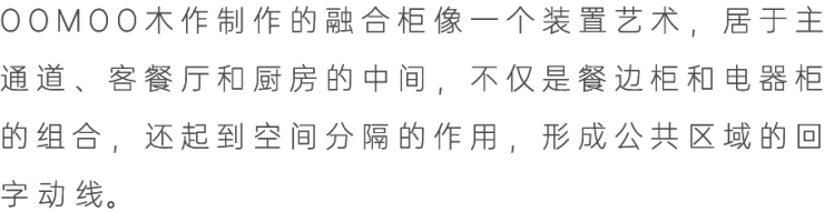 进门用一个横向通道作为入户的玄关,同时在后面安排出一个房间,大门正面挂了一个年轻艺术家的画,入户右侧故意留了一个采光窗,可以让一束光,进入这个过道。门后面安排了一个转角柜,一是作为入户的收纳,放些衣服和鞋子,底下的悬空部分,则是扫地机器的位置,可以自清洗,方便生活的打理。