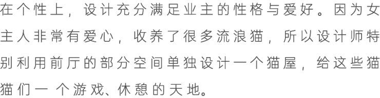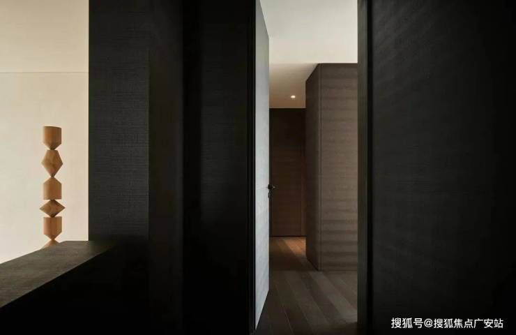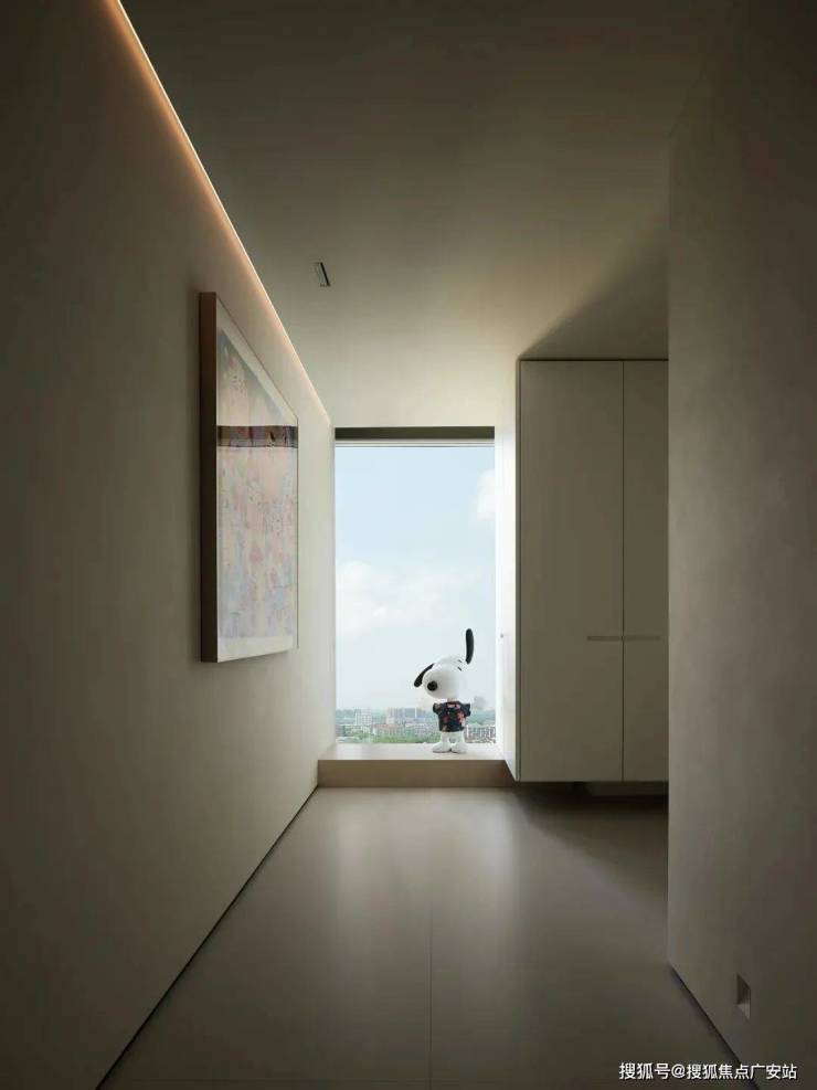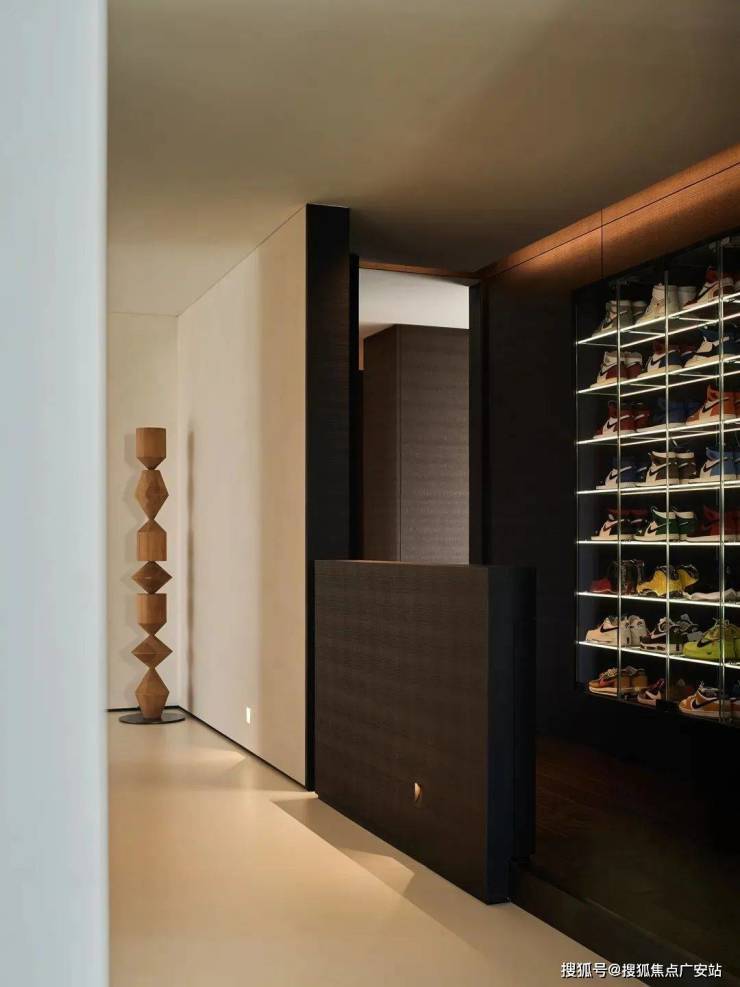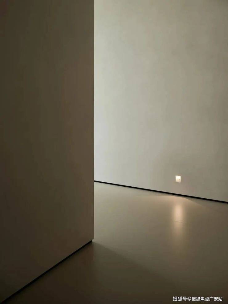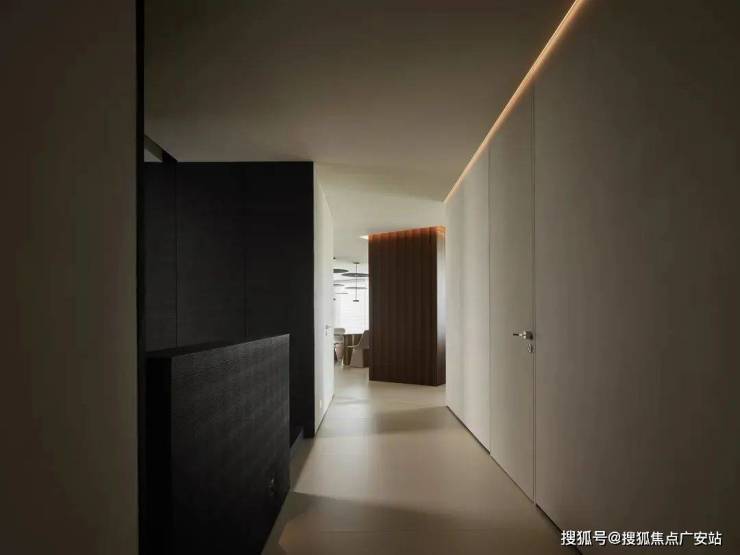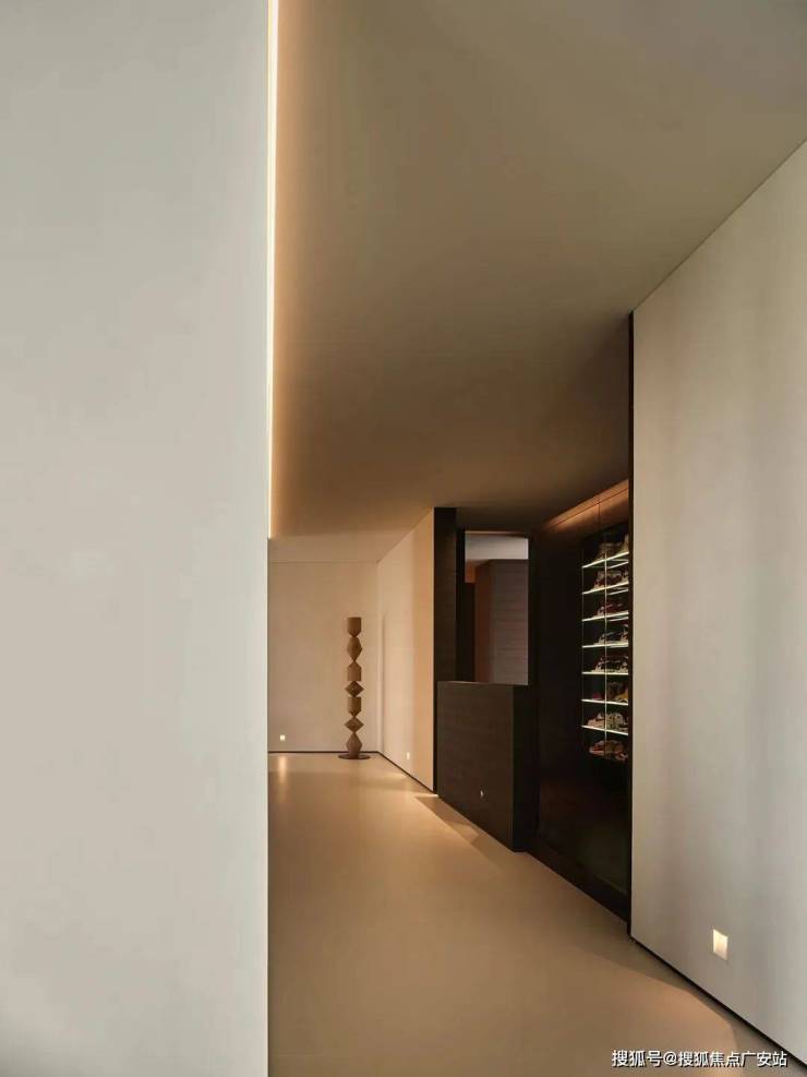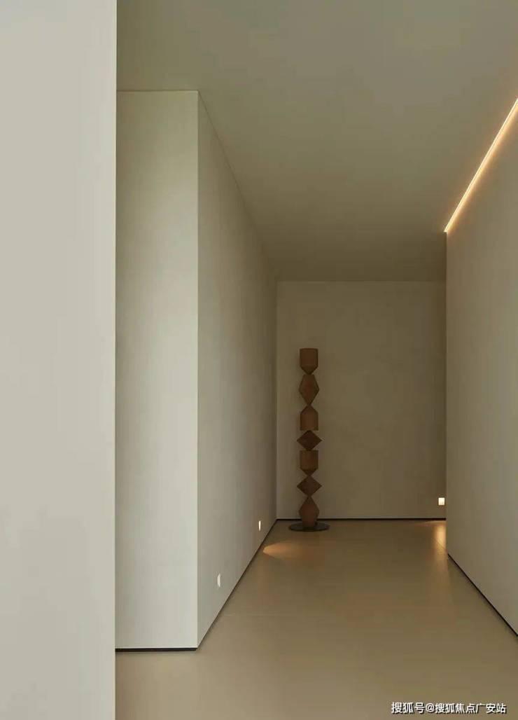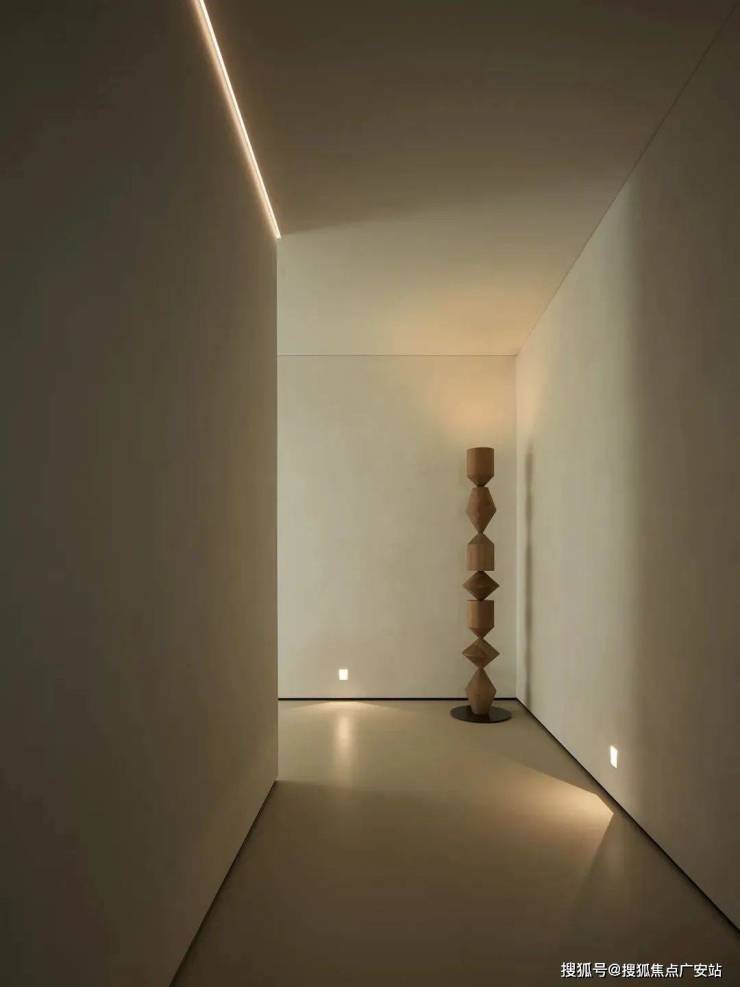 长廊是动静空间的过渡区域,通过光线和艺术品的点缀,让人的视觉体验更加舒服。沿着灯光的指引向左,可以进入室内。这里设计师准备了两组灯光,除了顶部的线性灯指引之外,还有一组地脚灯,在设计师的构想中,地灯是为男主人夜晚归家时留的点点温暖,代表了家人的关怀和迎接。