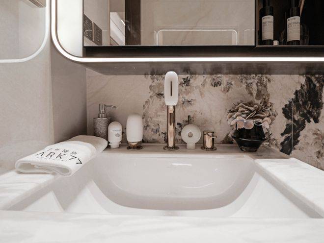 进门左手边,雪山银湖透光奢石作为置物台面,质感非凡。