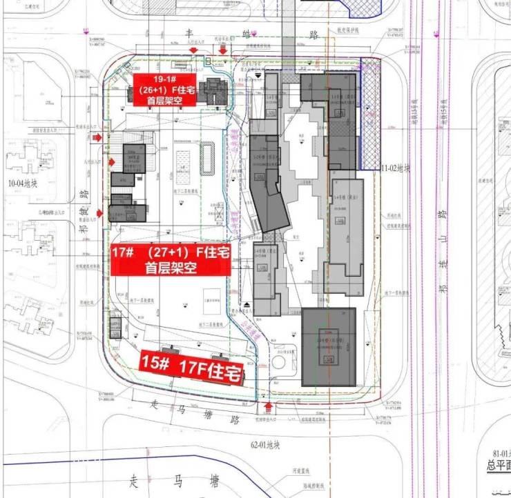 11-01地块为商住办混合用地,住宅分布在地块的西侧,由3幢高层住宅组成。社区内部有大面积的水系景观,商业和住宅部分有公共通道分隔,全部人车分流。