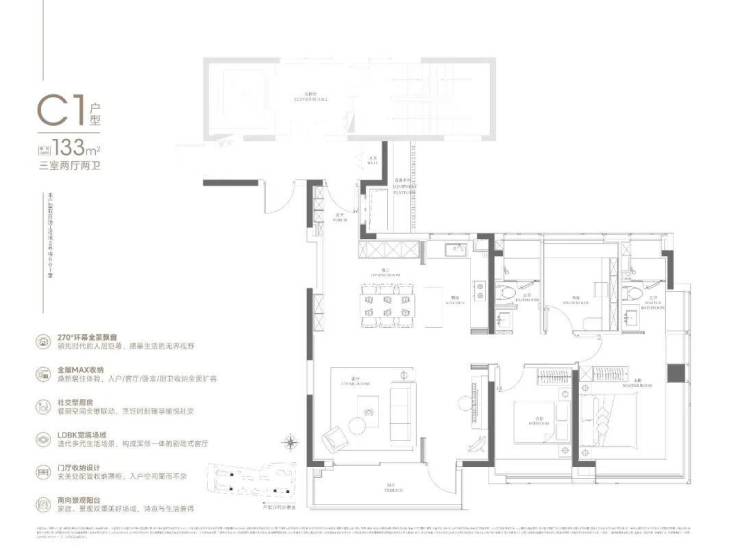 133㎡可以说是108㎡的进阶款,同样的三房两厅两卫,大面宽横厅、半开放式厨房设置岛台,加上主卧L型飘窗,再一次验证了华润置地豪宅化的产品思路。