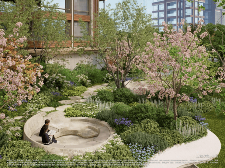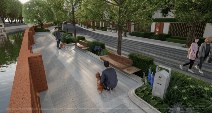 约7000㎡风貌邻里新弄堂延续石库门肌理,将社区咖啡、艺术工坊、便民市集等多元业态融入其中,构建开放、融合的步行尺度共同体—— 文艺氛围与人间烟火在此交织,打破了高端社区的疏离感。而九龙路滨水归家秘境,通过宠物友好花园、文化记忆景墙、适老化座椅