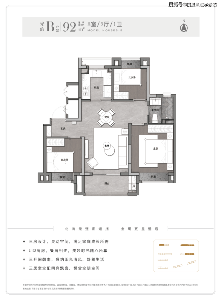 建面约92㎡3房2厅1卫,三开间朝南,南向总开间约10.6米,分区明确,布局合理。🔝 新长宁·水韵名邸售楼处热线☎️☎️:400-9966-940🛐🛐