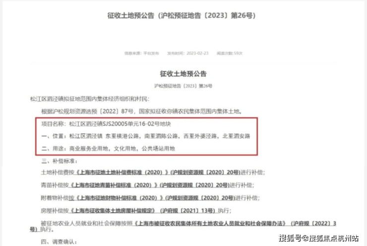 今年2月23日,上海市松江区人民政府官方网站发布《泗泾镇SJS20005单元16-02号地块征收土地预公告》,该地块位于泗泾地铁站北侧,规划用途为商业服务业用地、文化用地、公共场站用地。