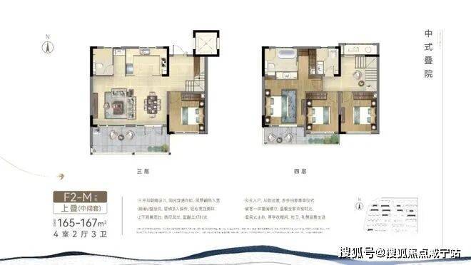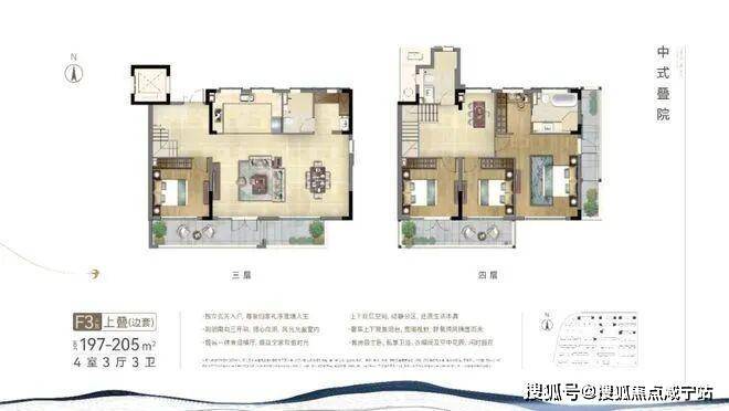 项目中叠户型方正,三开间朝南,最大限度的采光,同时功能齐全,居住舒适。这个户型从街巷的北侧入户,与下叠的南侧入户形成分流,很好地提高了私密性,大门入户是中式的门头,尽显中式韵味。
