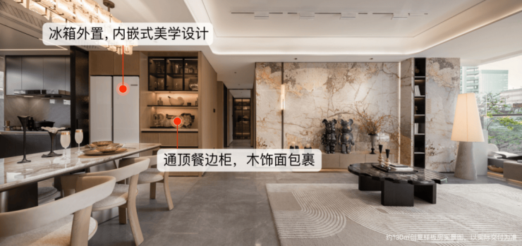 比如墙面使用大量温润木饰面铺陈,电视背景墙选用岩板,客厅地面铺设云朵拉灰石材、餐边柜台面镶嵌卡里冰玉大理石,将高级感渗透到生活的每个角落。