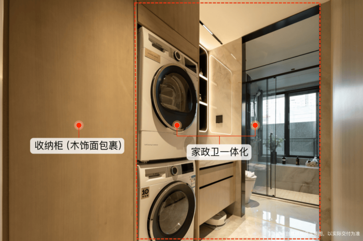 值得一提,家政卫一体化,动线更流畅,洗完澡可以顺手把脏衣服放到洗衣机,更彻底解放阳台,阳台不用晾晒,完全成为志趣空间。