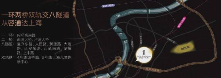 1环2桥2隧道双轨交:内环内,南浦大桥、卢浦大桥,复兴路隧道、人民路隧道,门口轨道交通4/6号线。