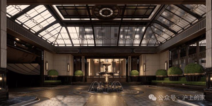 走进落客区,头顶美轮美奂的约300㎡彩色玻璃穹顶,灵感来自于和平饭店,融入老洋房PRADA荣宅的特殊徽章转译。其中水波纹玻璃、镶嵌玻利维亚蓝奢石带来了丰富的层次感,光影相间的繁复感,仿佛让人步入时光长廊,这样充满艺术性的归家礼仪,让人一眼着迷!