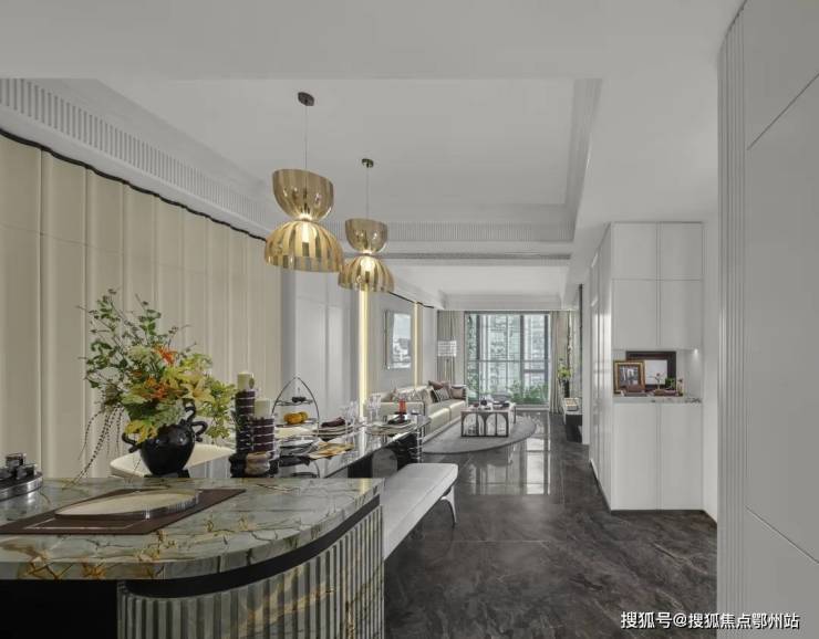 客厅、餐厅部分,整体是贯通的。从南边的阳台到北面的厨房、次卧的墙这里,一镜到底。这个客厅感觉是150㎡以上的奢级户型配置。