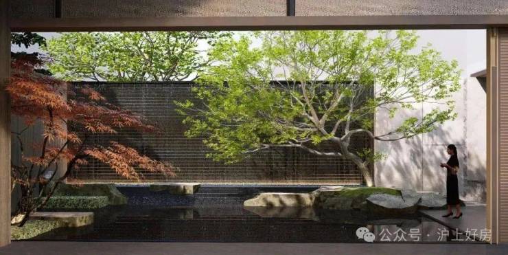 一进院:社区门口的 6米宽瀑布景墙+落石+大乔组合,构筑起一道 天然噪音屏障,进入瞬时隔离城市喧嚣!