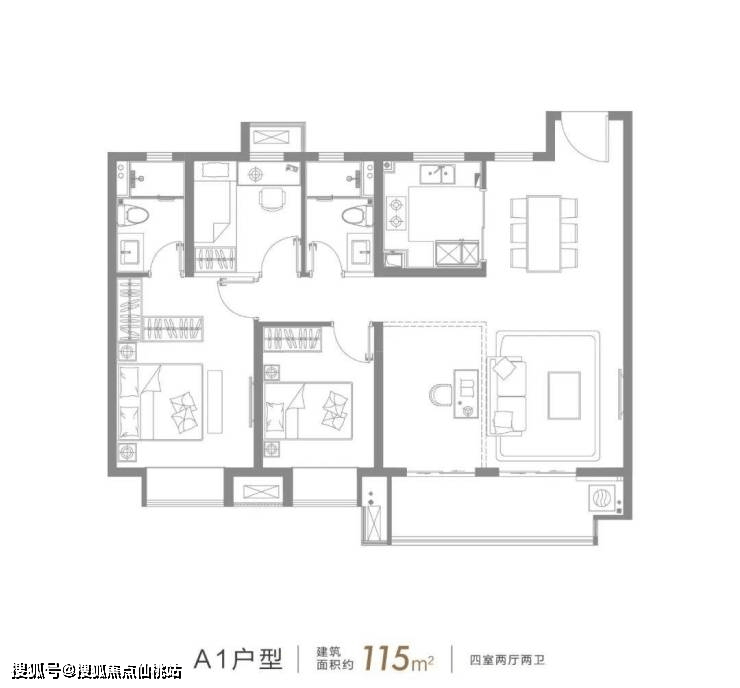 建面约115㎡的4房2厅2卫户型,超大面宽南向阳台、整体南北通透、主卧套房的设计,这个户型实现了多数人对于未来生活的期待。