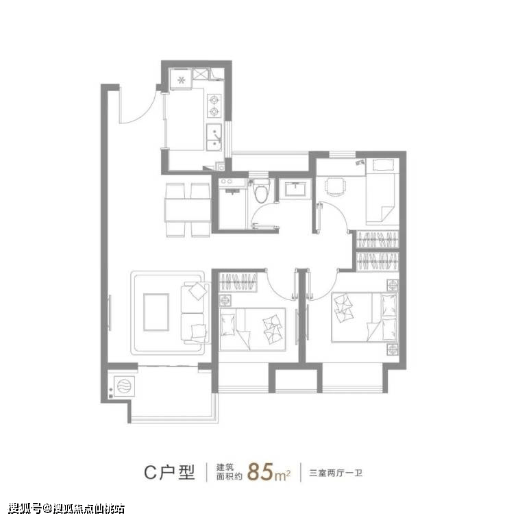 建面约85㎡的3房2厅1卫,三开间朝南+整体动静分离的设计,都保证了这个户型的居住舒适度。整个户型全明设计,户型方正,南北通透,卫生间干湿分离,光明对于产品细节的把控力可见一斑。