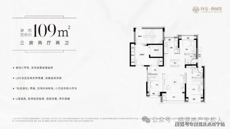 109㎡飞机户型 如展翼之鹰,以全屋四飘窗衔光纳景,南北通透的朗阔厅堂划破传统连廊的桎梏,让每一次归家都如航向无界天际;