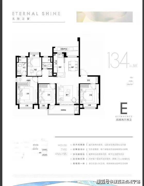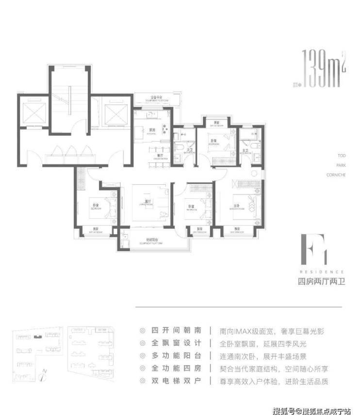 约130㎡四房双套间:独立家政间+中西双厨设计,四开间朝南引入全天候阳光,270°转角阳台俯瞰双公园景观。