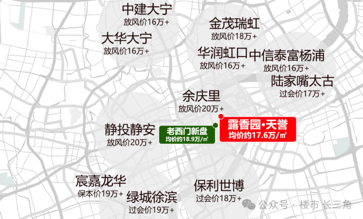 在老西门新盘半年涨价1.1万/㎡至18.9万/㎡的时候,露香园的均价依然仅约17.6万/㎡,确实太香了。