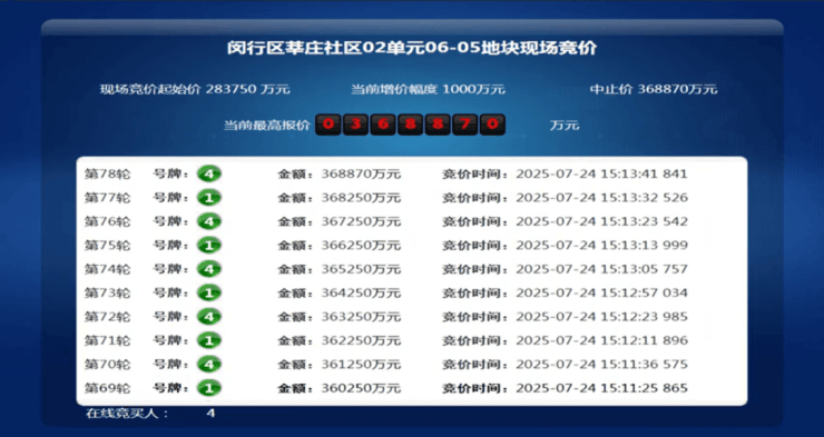 7月24日,上海第六批次土拍首日,莘庄板块时隔两年多迎来新的土地供应。地块历经多轮激烈竞价,触及30%溢价率上限后转入“竞高品质”环节。最终,装修标准被推高至4000元/㎡,并需配建2650㎡公共服务设施,由安高成功竞得,板块新地王由此诞生!