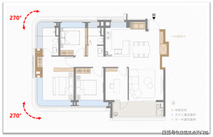 第三处山墙s墙的技术含量更高,直接让户型拥有两个大转角飘窗(主卧+主卫均双270°弧形转角飘窗)。凹处填放一个衣柜,视觉效果舒适,业主第一眼无知无觉,殊不知背后大有玄妙。