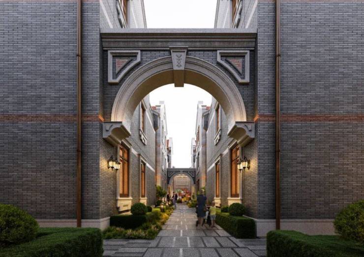 拱形门坊及雕花复刻湖州会馆、菱形山花元素还原老建筑印记、巷道风貌铺装叠加红砖清水墙赓续衡复风貌,演绎百年摩登风尚。
