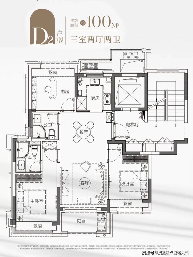 另一套 建面约100㎡飞机户型,同样做了三房两卫,户型方正,几乎无过道设计,每一寸空间都没有浪费,舒适不局促。