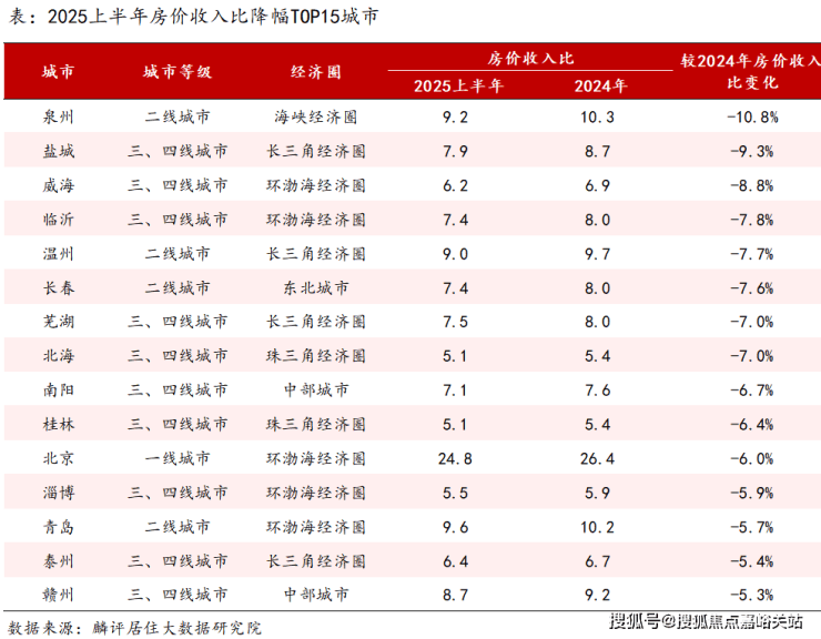报告显示,2025上半年一线城市房价收入比为25.4,较2024年下降2.7%;二线城市房价收入比为10.5,较2024年下降2.8%;三四线城市房价收入比为7.4,较2023年下降3.0%。