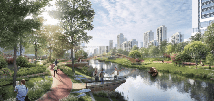 生态绿廊实景呈现:约 200亩“绿野谷”生态走廊一期示范段已实景呈现,绿意盎然,二期建设稳步推进,未来将与迎虹湖(规划中)、一字川滨河水岸(规划中)共同构建中央公园式的生态住区。