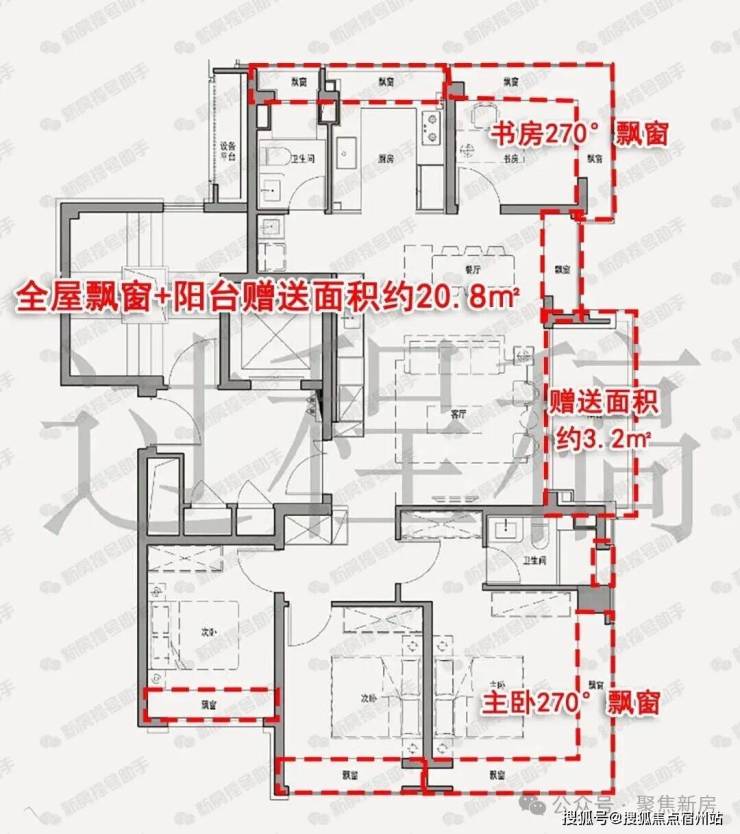 2、附赠空间升级:全屋满飘窗设计,赠送面积超多,约20.8㎡!提升整体空间尺度感、可利用延伸空间功能性更强!