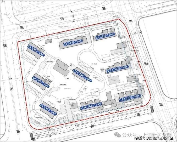 根据项目规划设计方案,项目拟建9栋25-32层高层住宅。全部楼栋均采用一层架空设计。项目采用完全式人车分流设计,人行主出入口位于德州路,三个车行出入口分别位于位济明路、德州路和德恒路。
