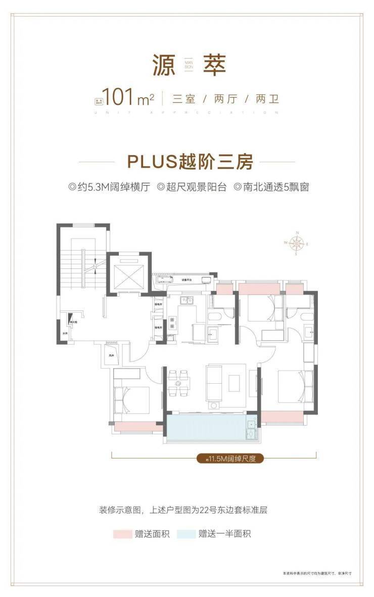 建面约101㎡3房2卫户型,非常标准的飞机户型。