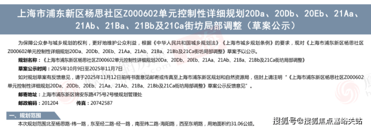 近日,《上海市浦东新区杨思社区Z000602单元控制性详细规划20Da、20Db、20Eb、21Aa、21Ab、21Ba、21Bb及21Ca街坊局部调整》草案正式公示。