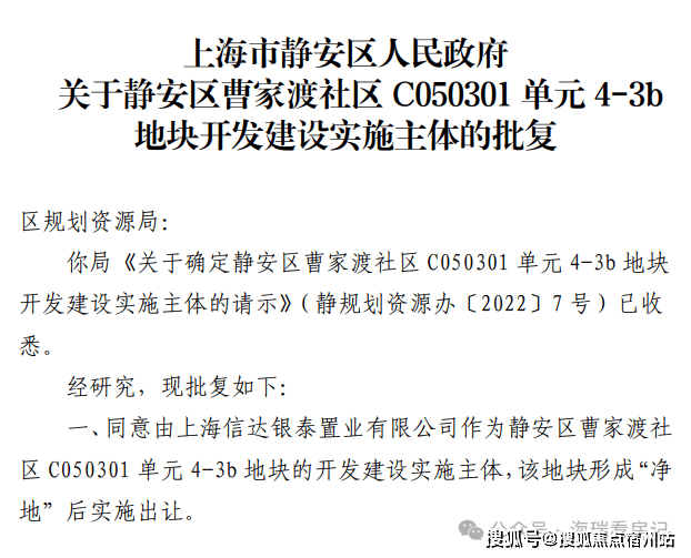 2022年6月,静安区人民政府官宣了曹家渡社区C050301单元4-3b地块的出让公告。