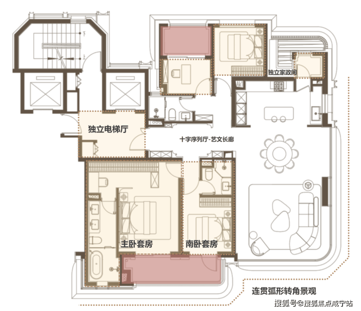 弧形转角阳台、主卧弧形转角窗,不仅是呼应立面设计理念,也柔化了室内空间,带来更舒适连贯的转角观景体验。