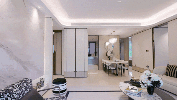 同样一梯一户的私享电梯厅进门,将通过艺术长廊,双面景观客厅就呈现在眼前。