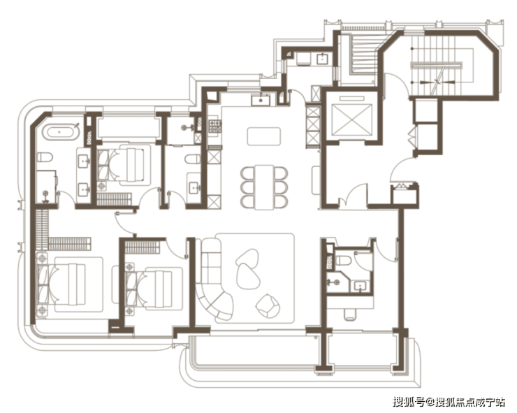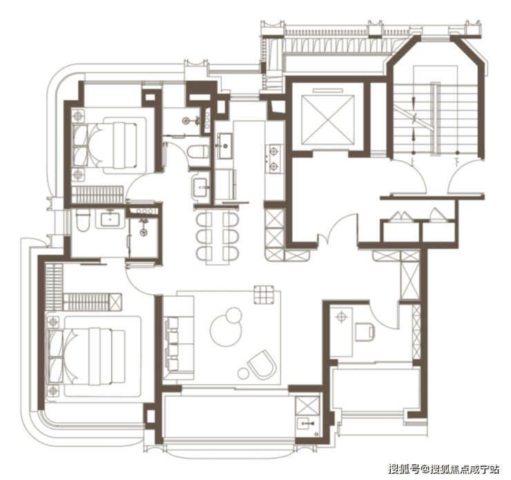 客厅阳台,南次卧阳台,北次卧阳台,三大阳台极大扩展套内空间。这也是新规执行后,最能给购房者带来实际收益的地方。完全扩展后,完全可以对标老规范中200㎡以上的产品套内体验。