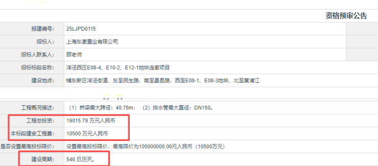 11月 上海市建设市场信息服务平台发布“ 洋泾西区E08-4、E10-2、E12-1地块连廊项目 ”资格预审公告,显示项目已进入工程实施前的 招采推进阶段 。