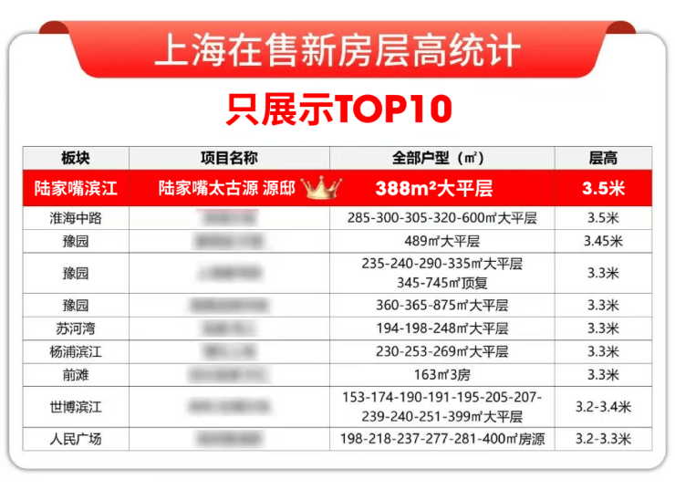 约3.5米墅级层高。据小胖君统计,市面顶豪项目层高普遍在3.3-3.4米,而层高能达3.5米及以上的只有两三个,陆家嘴太古源 源邸就是其中之一。